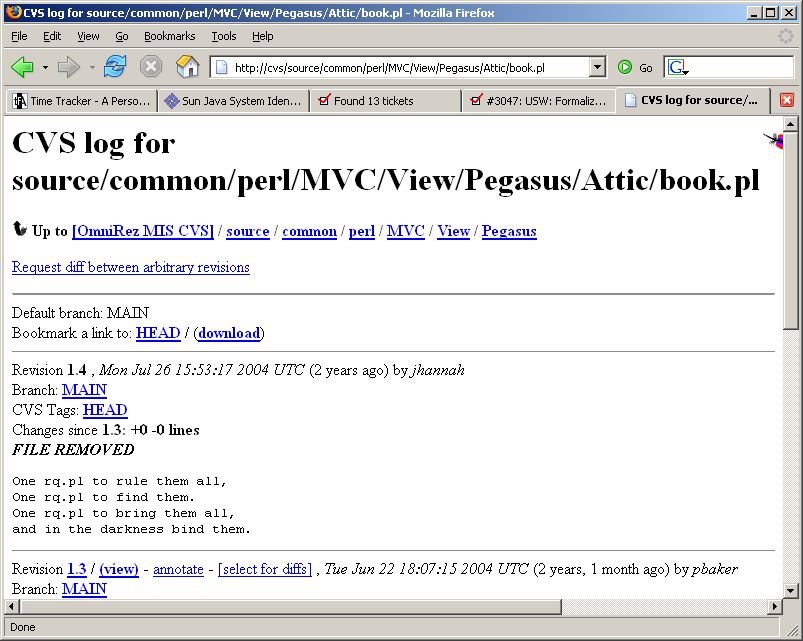 2 years ago I eliminated 3 function-specific programs book.pl pals.pl rpin.pl in favor of 1 generic program that could handle all 3 functions rq.pl I stumbled into my CVS entry for that day just now. It makes me laugh. See attachment. Grin, j